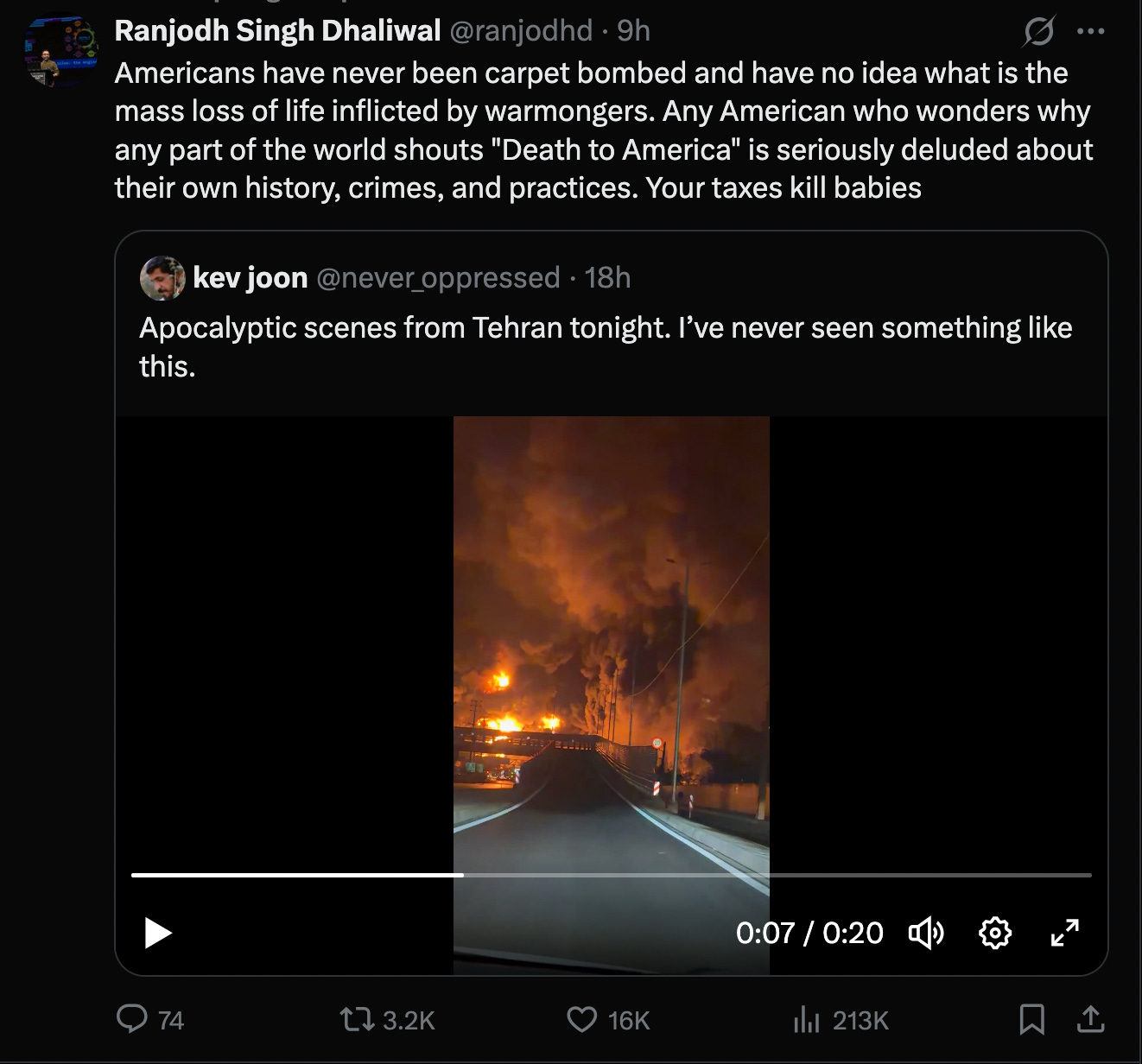 The footage from the ground in Tehran is apocaltypic and deplorable. It is already a humanitarian and ecological disaster: the US and Israel are now targeting oil depots, causing a black rain effect, releasing toxic gases into the atmosphere. And what is it all for?